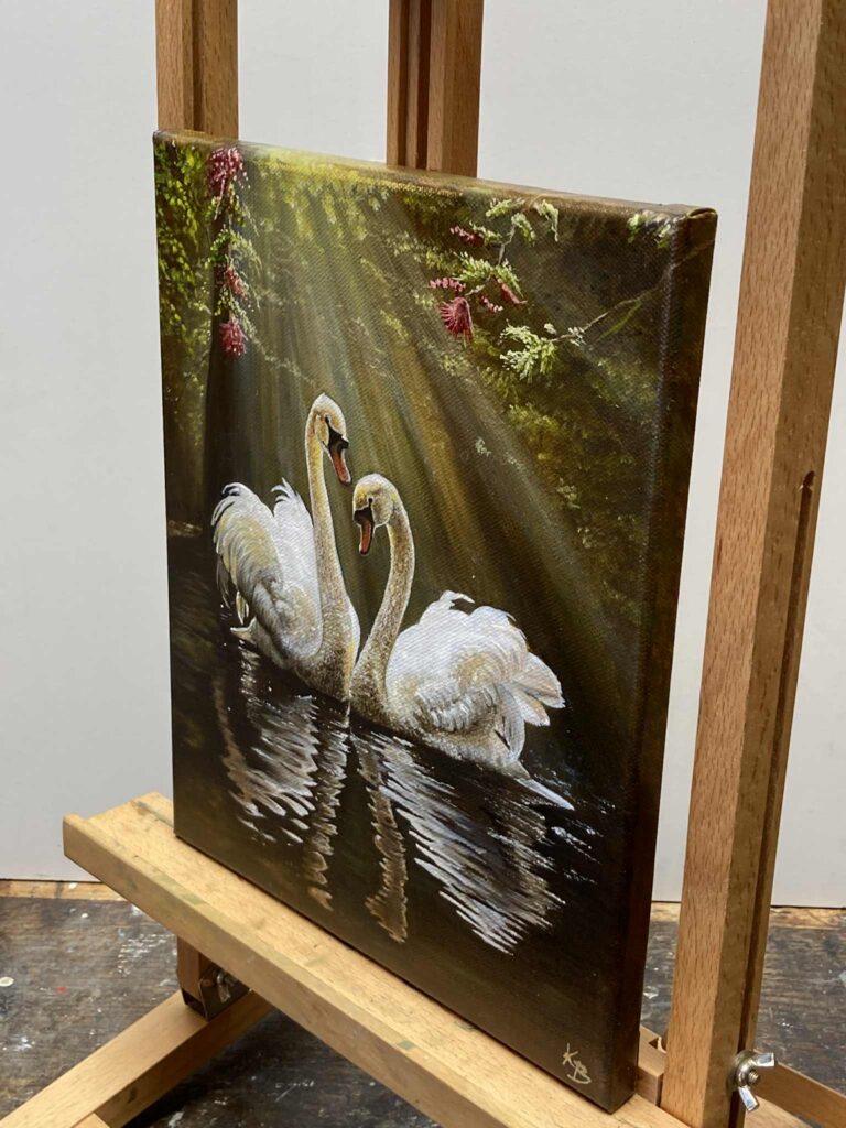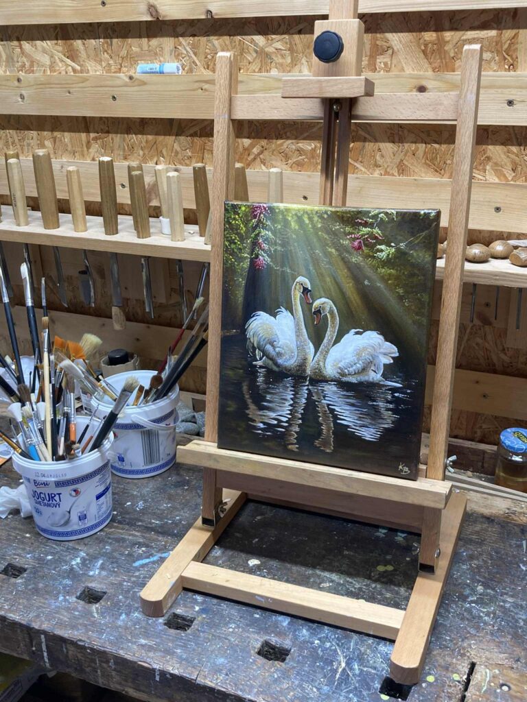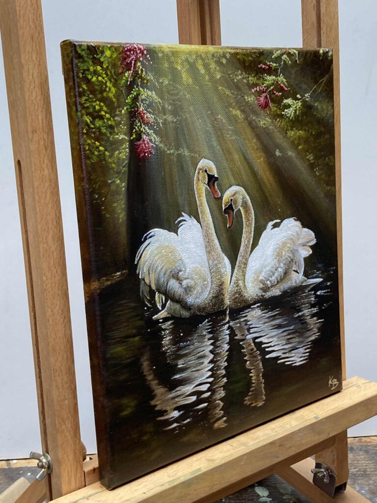 Labutě – olej na plátně 25 x x30 cm – srpen 2025